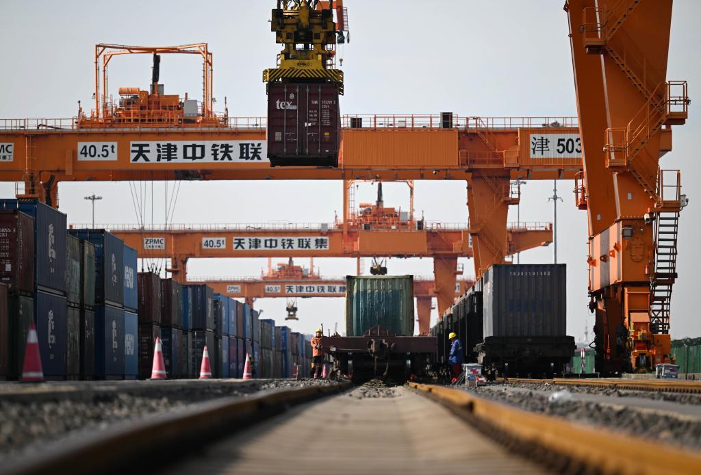 11月13日,在中铁天津集装箱中心站,龙门吊在进行装车作业。新华社记者 赵子硕 摄pagebreak