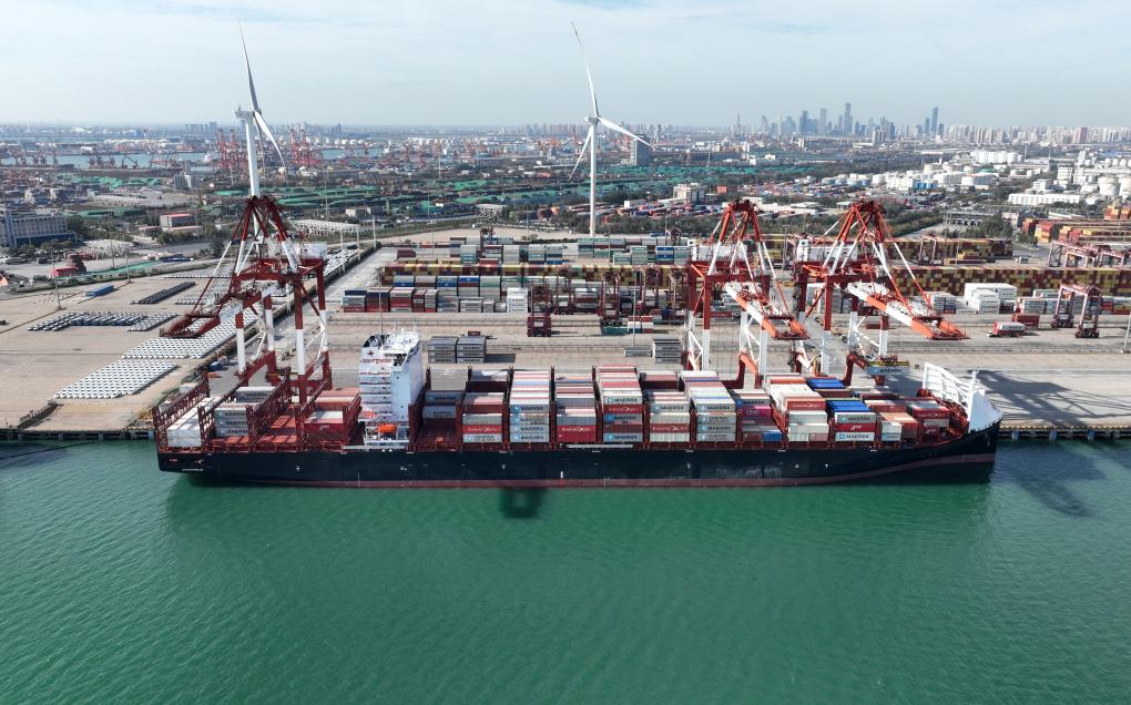 集装箱货轮停靠在天津港欧亚国际集装箱码头(11月13日摄,无人机照片)。新华社记者 赵子硕 摄pagebreak