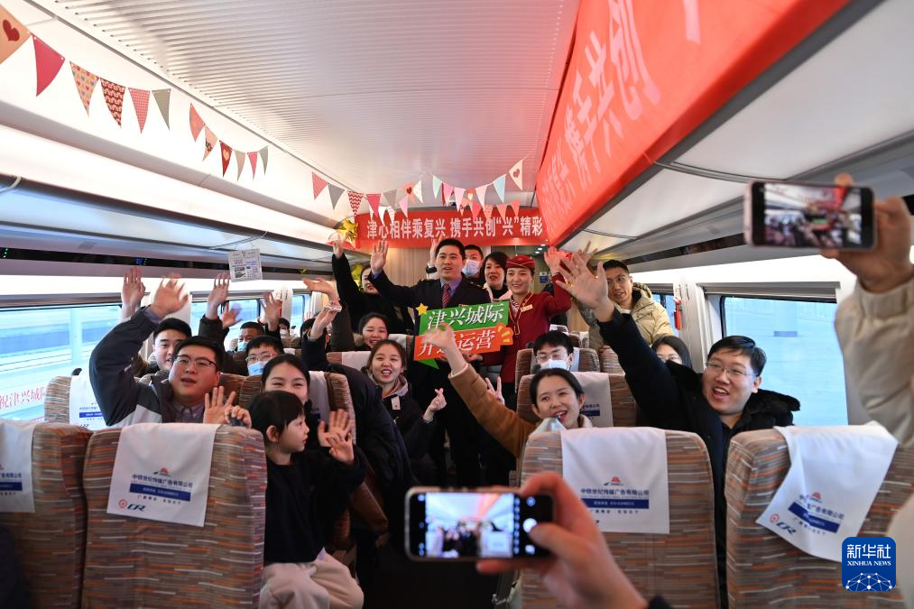 12月18日,津兴城际列车工作人员和旅客在车厢内合影留念。新华社记者 李然 摄