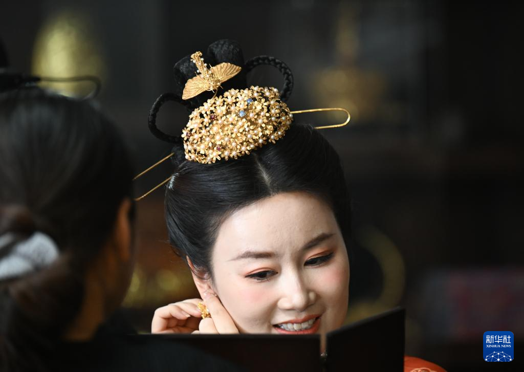 一名汉服爱好者在马赛的工作室内试戴花丝镶嵌技艺制作的头饰(3月7日摄)。新华社记者 孙凡越 摄pagebreak