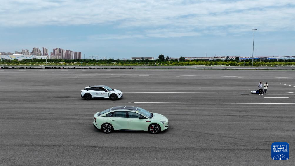 6月14日,测试车辆在天津(西青)国家级车联网先导区封闭测试场内进行自动驾驶主动安全功能测试(无人机照片)。新华社记者 孙凡越 摄