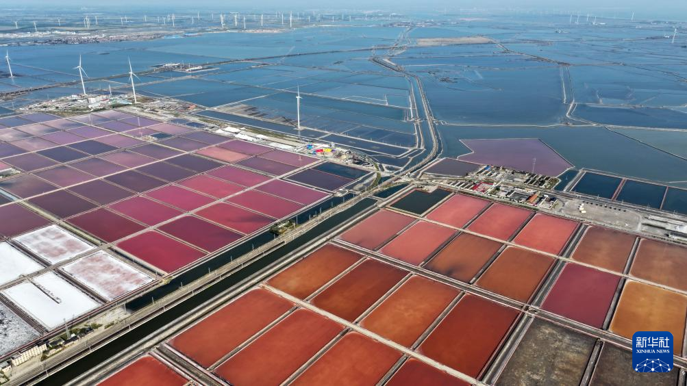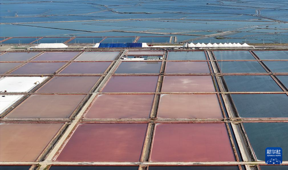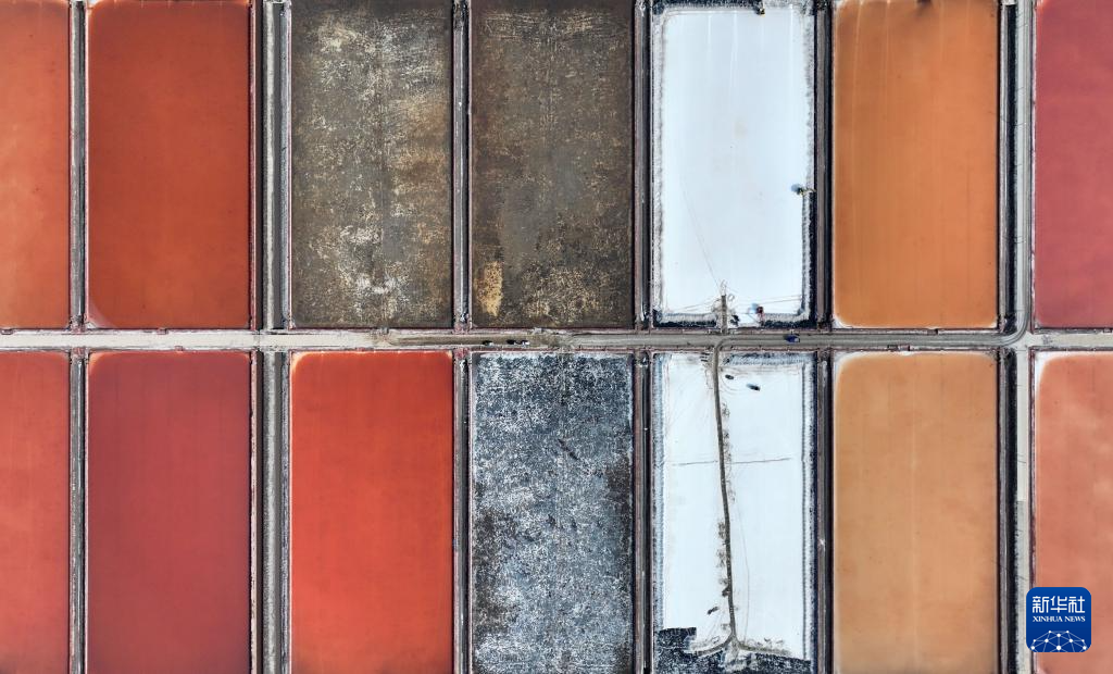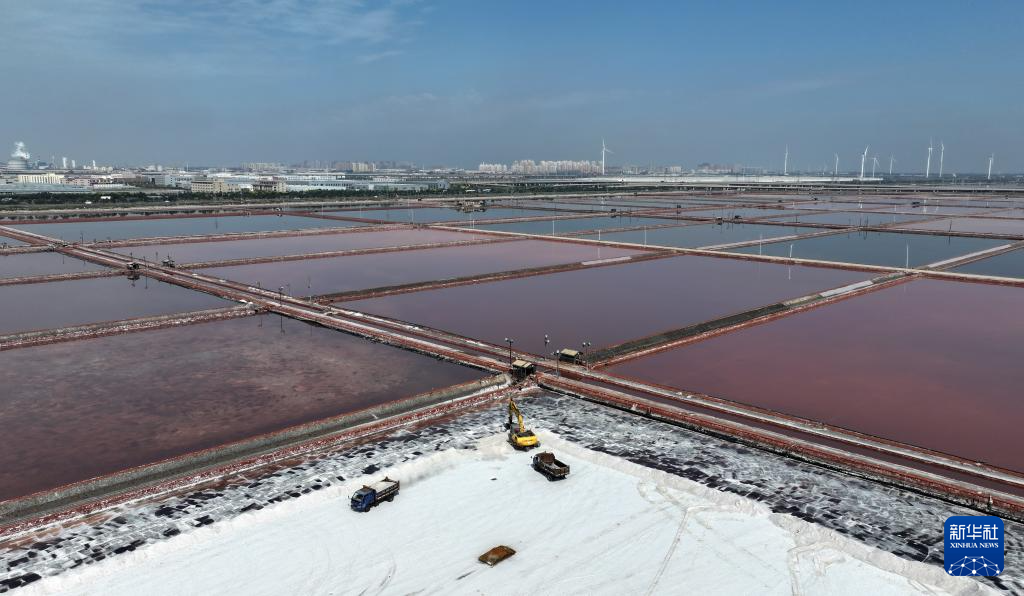 金秋时节,位于228国道旁的天津长芦汉沽盐场万亩盐田进入收获季,从空中俯瞰,在阳光的照射下,一块块结晶池整齐排列,宛如多彩的调色板。