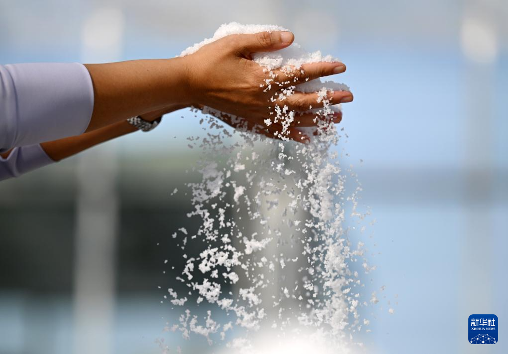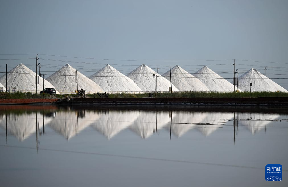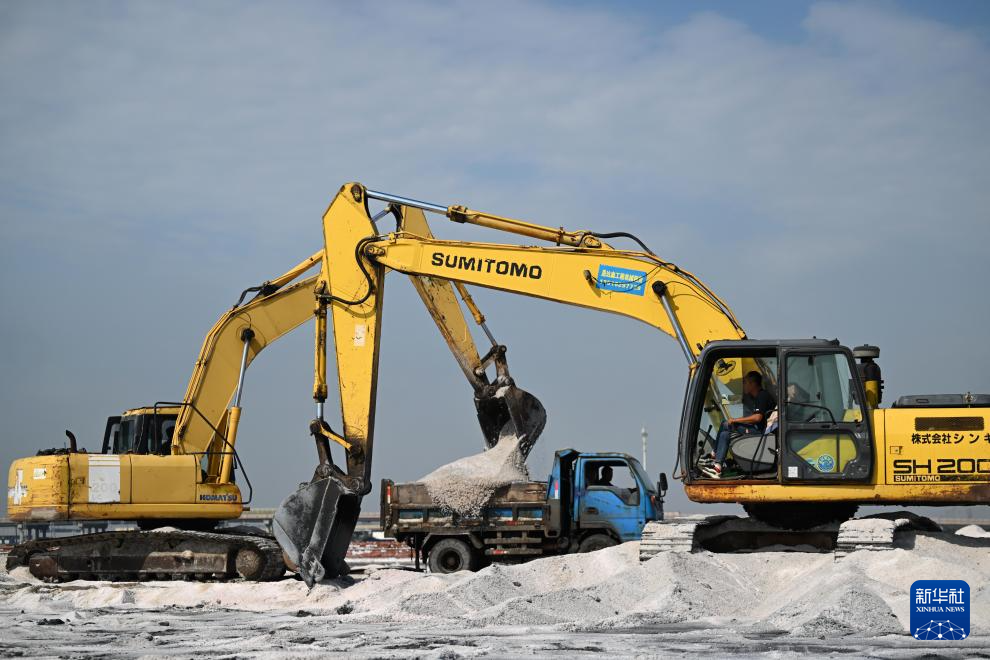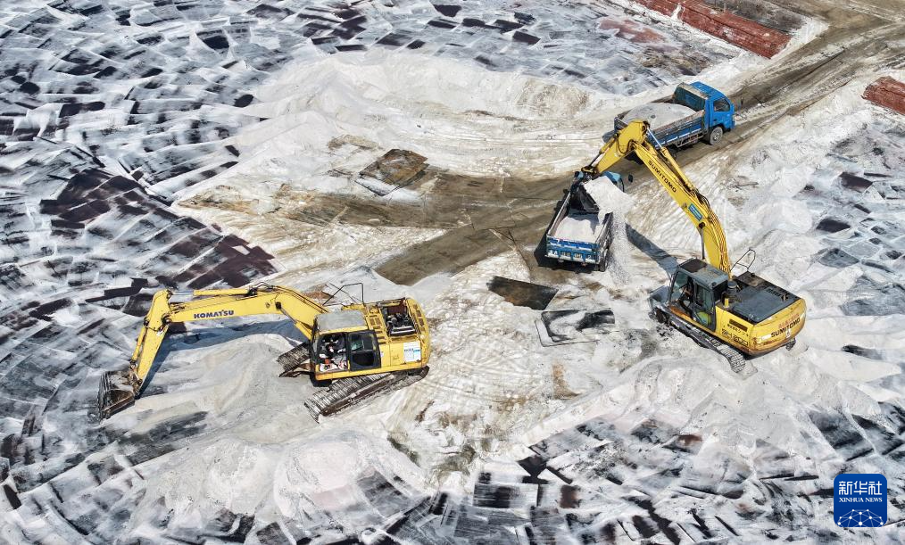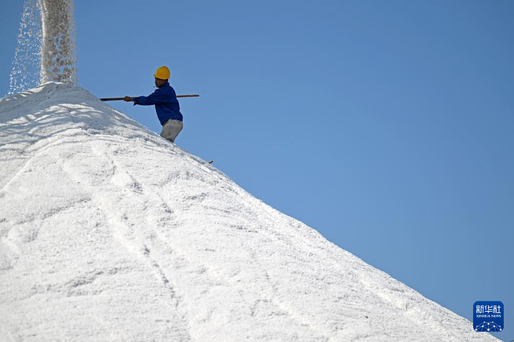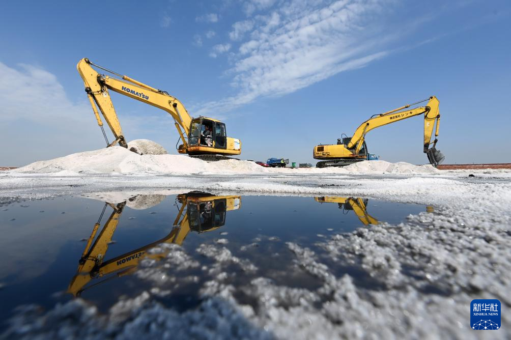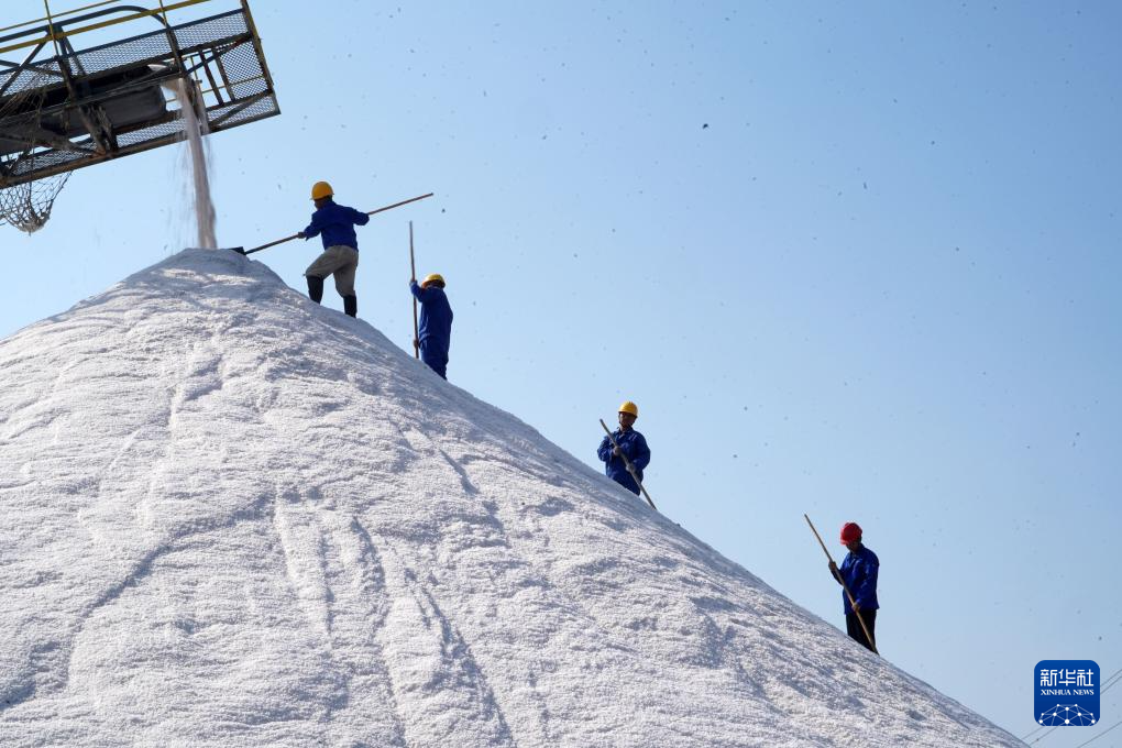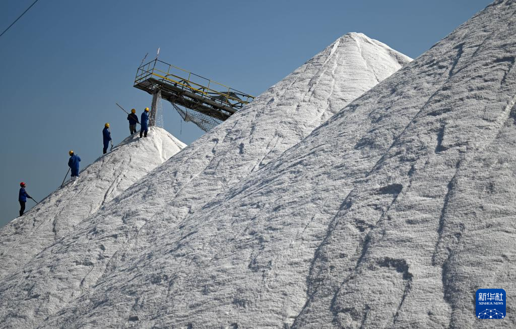收获季来临,挖掘机不停地用铲斗将盐晶聚拢成堆,车辆来往穿梭将原盐运输到传送带上,然后双臂堆坨机再将盐堆成一座座10余米高的盐山。经过自然晾晒,控淋去除多余的水分后,原料盐被运往相关企业。