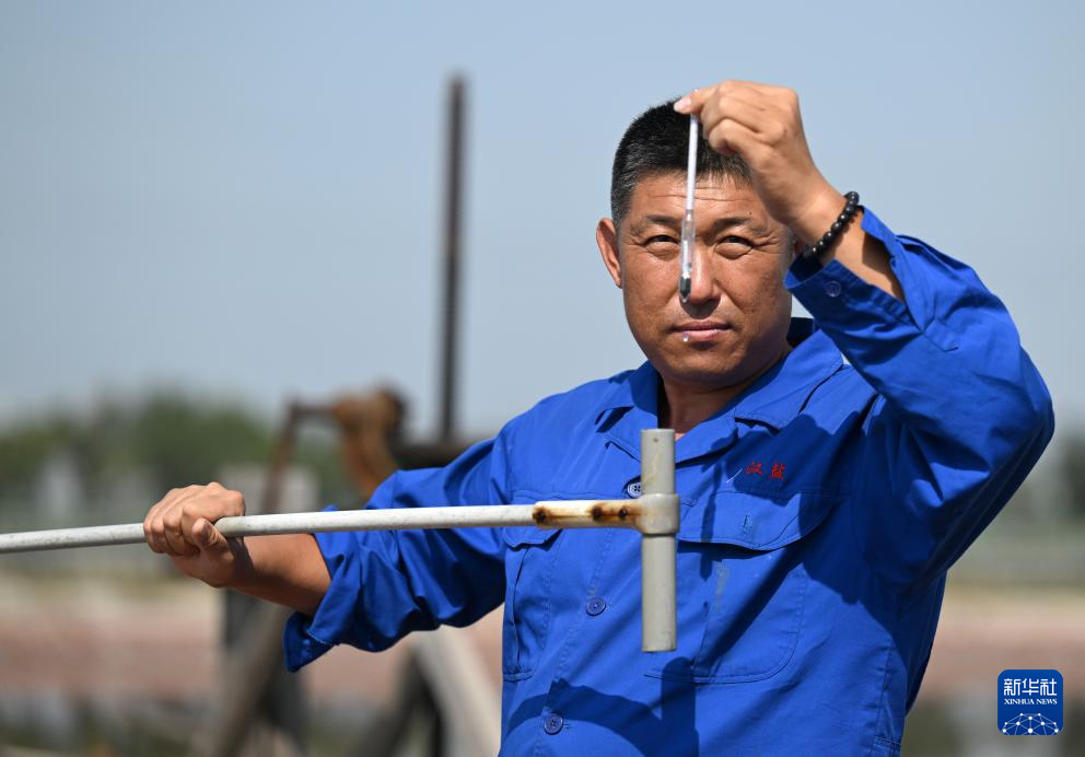9月26日,在天津长芦汉沽盐场,工人在测量盐池中的卤水含量。新华社记者 赵子硕 摄pagebreak