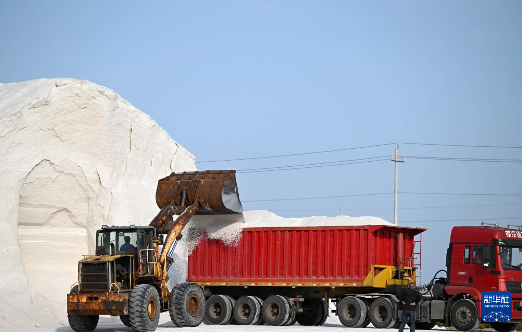9月26日,在天津长芦汉沽盐场,运盐车辆在装原盐。新华社记者 赵子硕 摄pagebreak