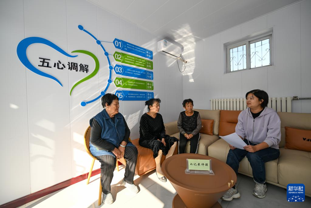 10月11日,在天津市宁河区芦台街道金华路社区,社区副主任、调解员张建玥(左三)解答社区居民提出的问题。新华社记者 孙凡越 摄
