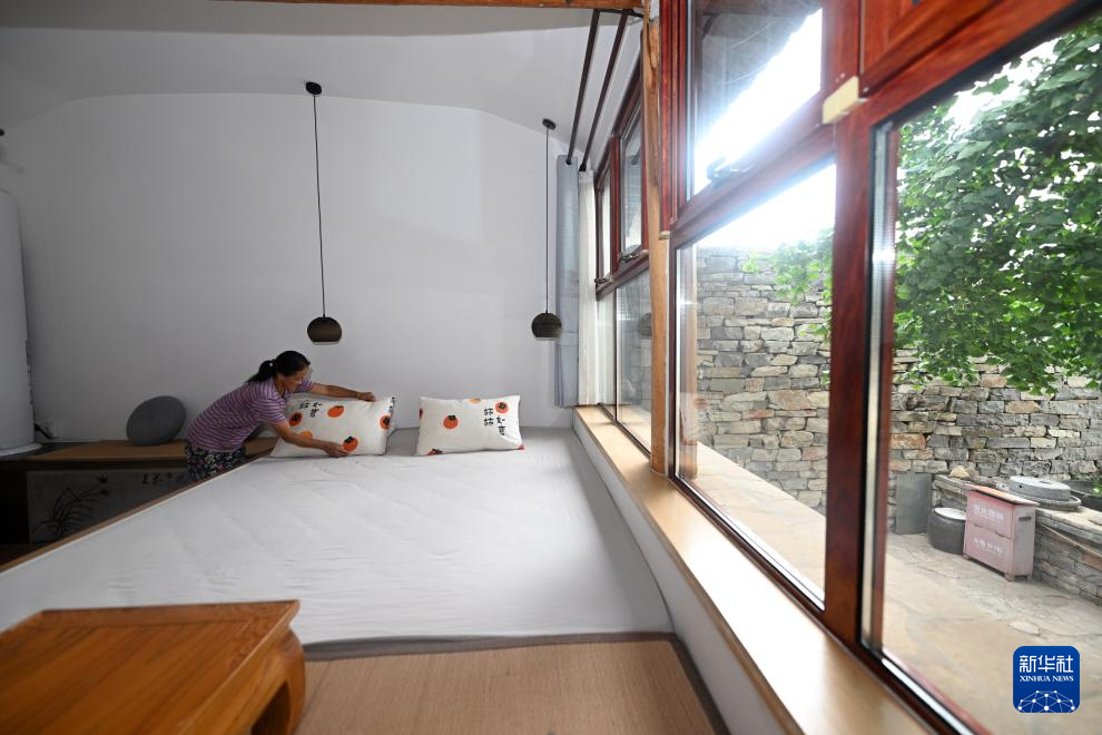在西井峪村的一家民宿内,工作人员在整理房间(7月6日摄)。新华社记者 赵子硕 摄pagebreak