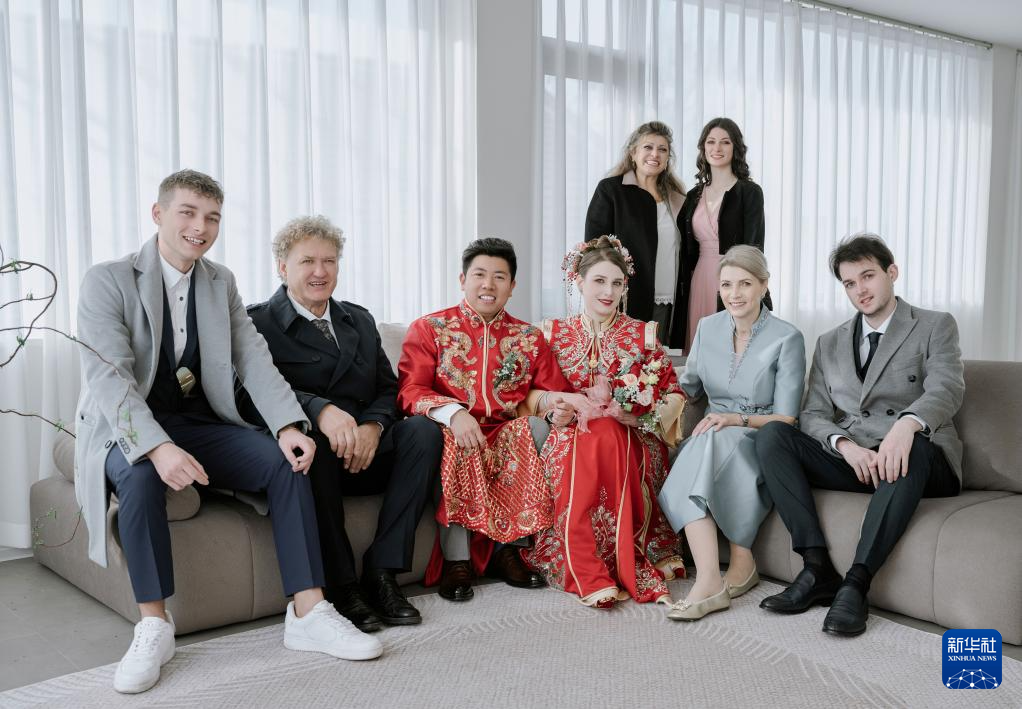 这是历剑(左三)、欧阳莎莎(左四)和她的家人朋友在天津市蓟州区官庄镇南营村自家民宿内拍摄的结婚照(2024年3月31日摄)。新华社发pagebreak