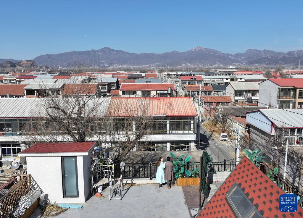 在天津市蓟州区官庄镇南营村,欧阳莎莎和丈夫历剑在民宿的露台上聊天(1月19日摄,无人机照片)。新华社记者 李然 摄pagebreak