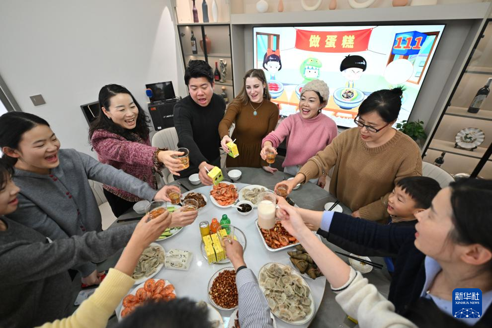 在天津市蓟州区官庄镇南营村,历剑和欧阳莎莎一家聚餐(1月19日摄)。新华社记者 孙凡越 摄pagebreak