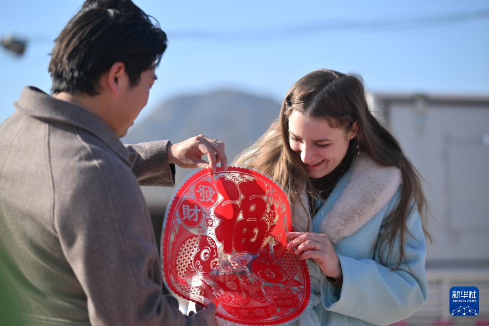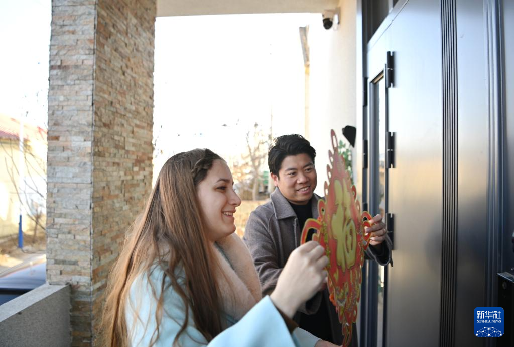 在天津市蓟州区官庄镇南营村,欧阳莎莎和历剑一起贴福字(1月19日摄)。新华社记者 李然 摄pagebreak