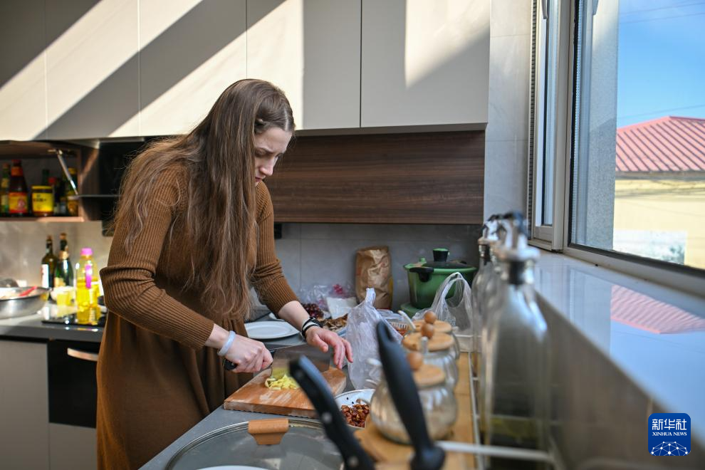 在天津市蓟州区官庄镇南营村,欧阳莎莎在切菜准备午餐(1月19日摄)。新华社记者 孙凡越 摄pagebreak