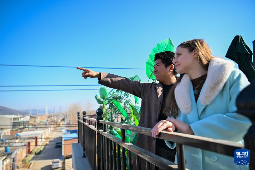 在天津市蓟州区官庄镇南营村,欧阳莎莎(右)和丈夫历剑在自家的民宿阳台上遥望远处(1月19日摄)。新华社记者 孙凡越 摄pagebreak