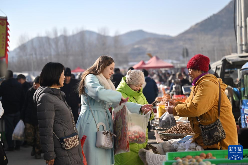 在天津市蓟州区官庄大集,欧阳莎莎和家人在大集上选购年货(1月19日摄)。新华社记者 孙凡越 摄pagebreak