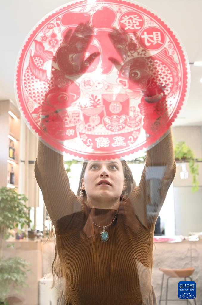 在天津市蓟州区官庄镇南营村,欧阳莎莎在贴窗花(1月19日摄)。新华社记者 李然 摄pagebreak