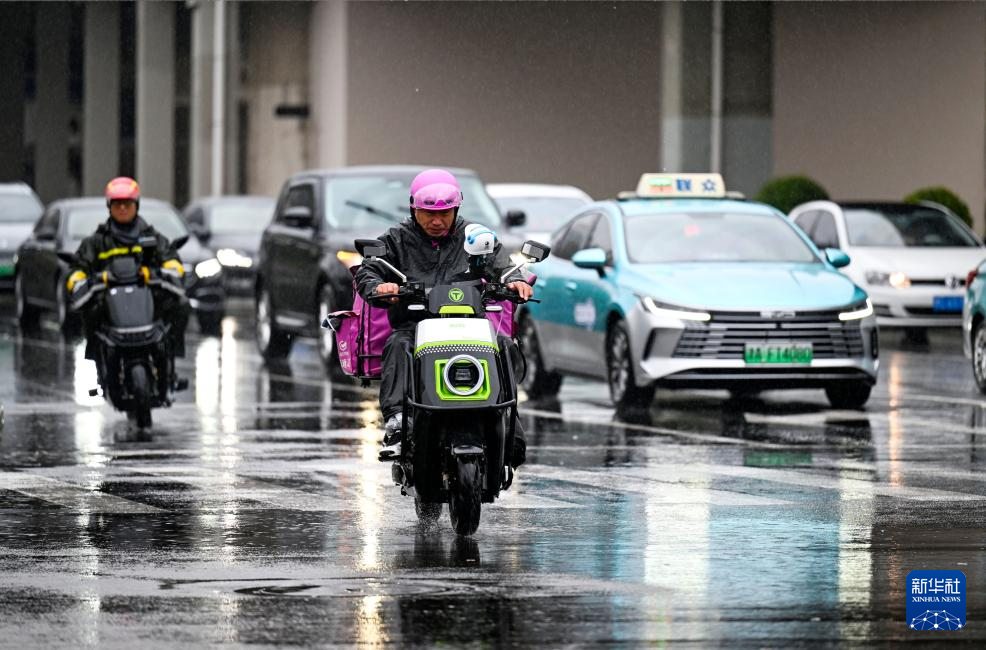 10月9日,在天津市南开区,骑手和车辆在雨中行驶。新华社记者 赵子硕 摄pagebreak