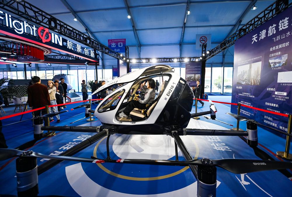 新华社天津10月19日电(记者杨文)会场上空,伴随着阵阵轰鸣,直升机表演的“空中芭蕾”引起阵阵欢呼;展厅内部,造型酷炫的大型eVTOL(电动垂直起降飞行器)和观光用的“敞篷”小型直升机吸引观众驻足拍照……