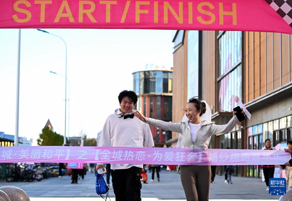 11月2日,参加活动的一对情侣冲过终点。新华社记者 赵子硕 摄pagebreak