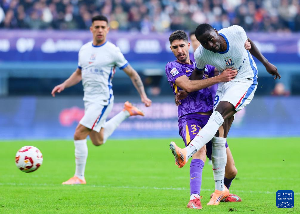 11月22日,上海申花队球员阿苏埃(右)在比赛中射门得分。新华社记者 孙凡越 摄