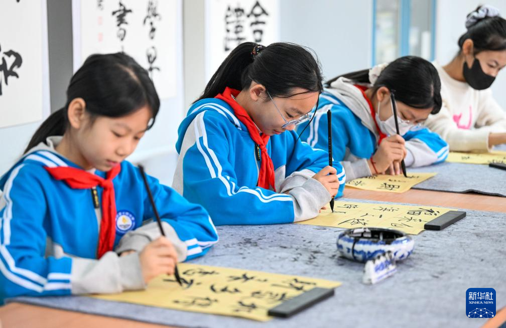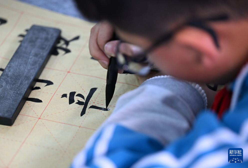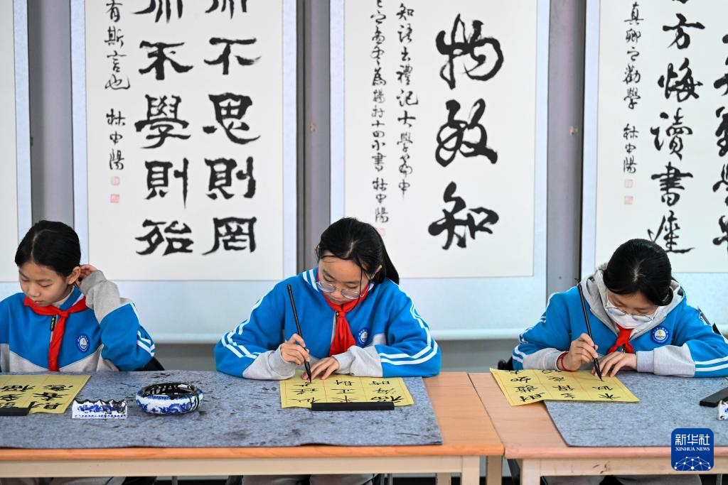 1月6日,在天津市武清区杨村第十四小学林中阳书法工作室,学生在练习书法。新华社记者 赵子硕 摄