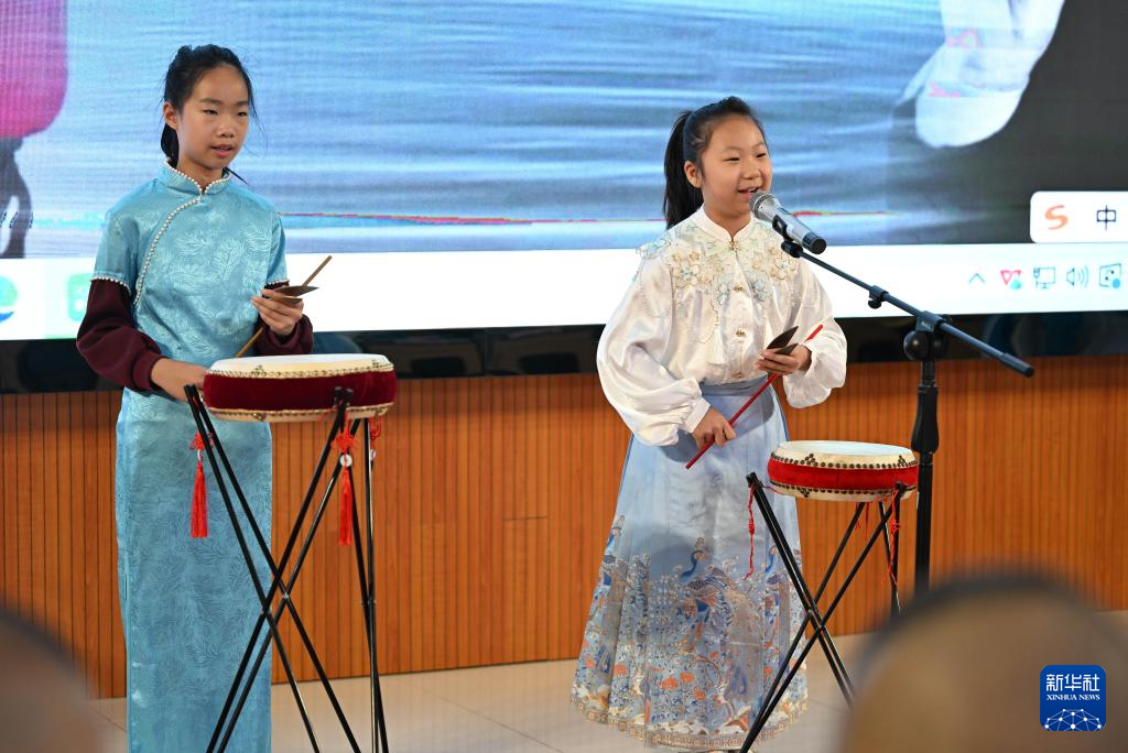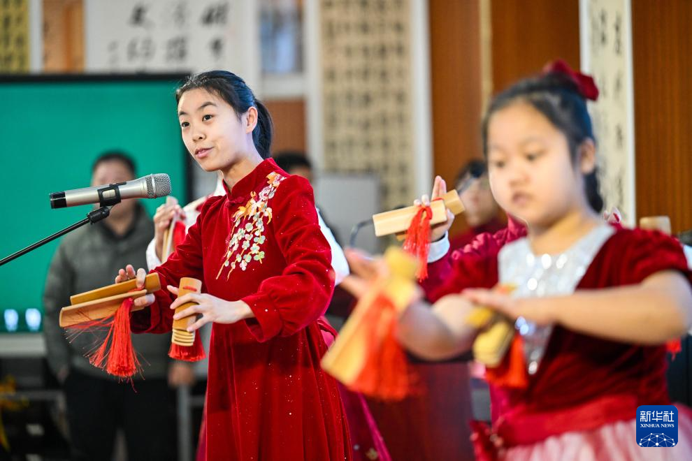 1月6日,天津市武清区杨村第十四小学学生在社团活动中表演京东大鼓。新华社记者 赵子硕 摄pagebreak