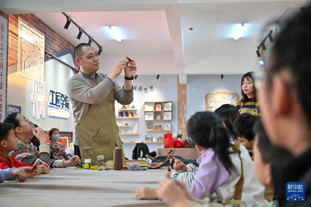 1月30日,天津市河北区王串场街道举办“修补巷·工匠学院”少年班活动。活动邀请“修补巷”里经验丰富的工匠师,向孩子们讲解皮具修补、织布等手艺,丰富他们的假期生活。
