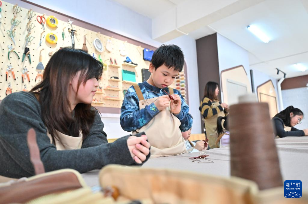 1月30日,在天津市河北区王串场街道环盛里社区,小朋友在工匠指导下缝补皮具。新华社记者 孙凡越 摄pagebreak