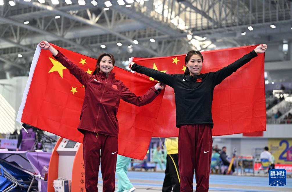 2月7日,冠军中国选手牛春格(左)、季军中国选手危菱侠在女子撑杆跳高颁奖仪式上。新华社记者 孙凡越 摄pagebreak