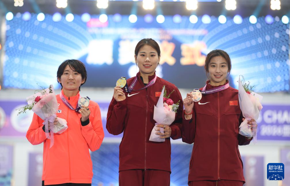 2月7日,冠军中国选手牛春格(中)、亚军日本选手诸田实咲(左)与季军中国选手危菱侠在女子撑杆跳高颁奖仪式上。新华社记者 孙凡越 摄pagebreak