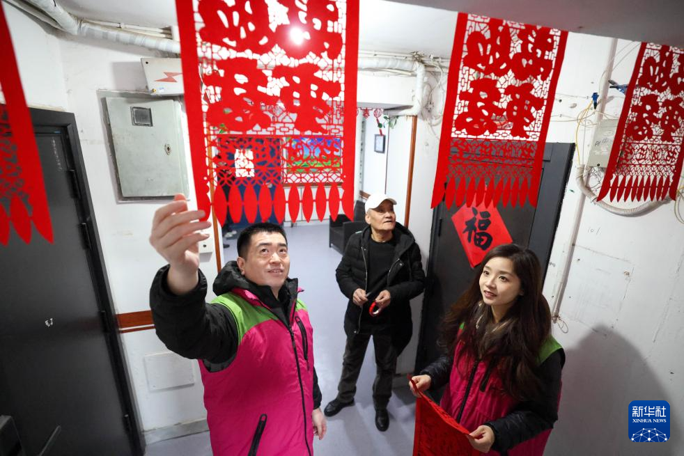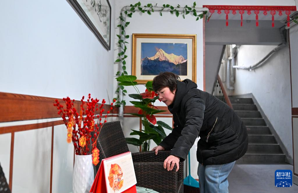 2月9日,在天津市河西区友谊路街道谊景村社区,物业工作人员装饰楼道空间。新华社记者 孙凡越 摄pagebreak