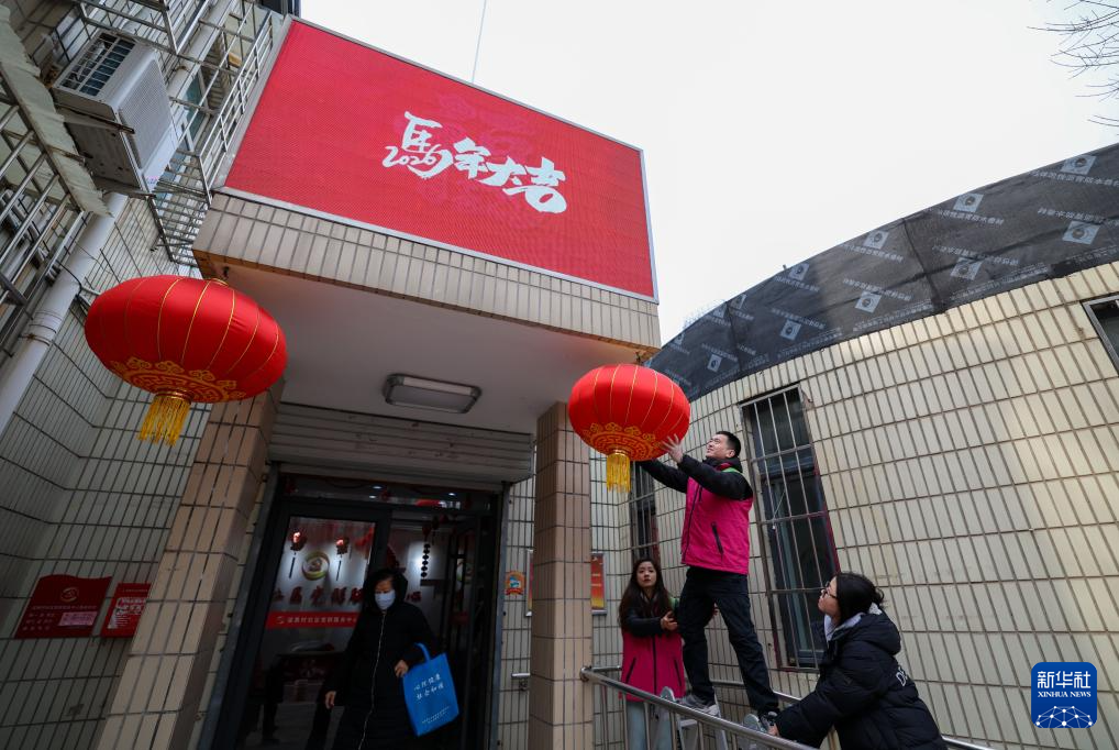 2月9日,在天津市河西区友谊路街道谊景村社区,社区工作人员悬挂红灯笼。新华社记者 孙凡越 摄
