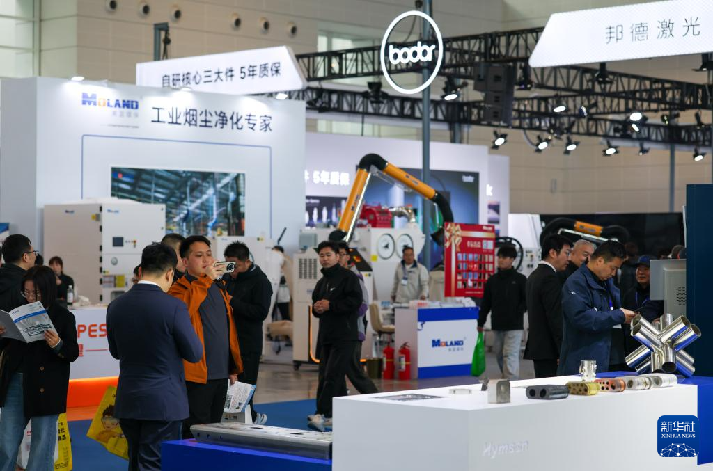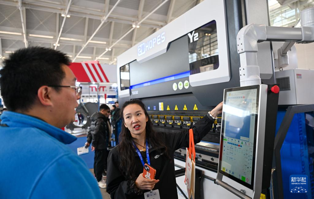 3月18日,参展商向观众讲解一款折弯机设备。新华社记者 孙凡越 摄pagebreak