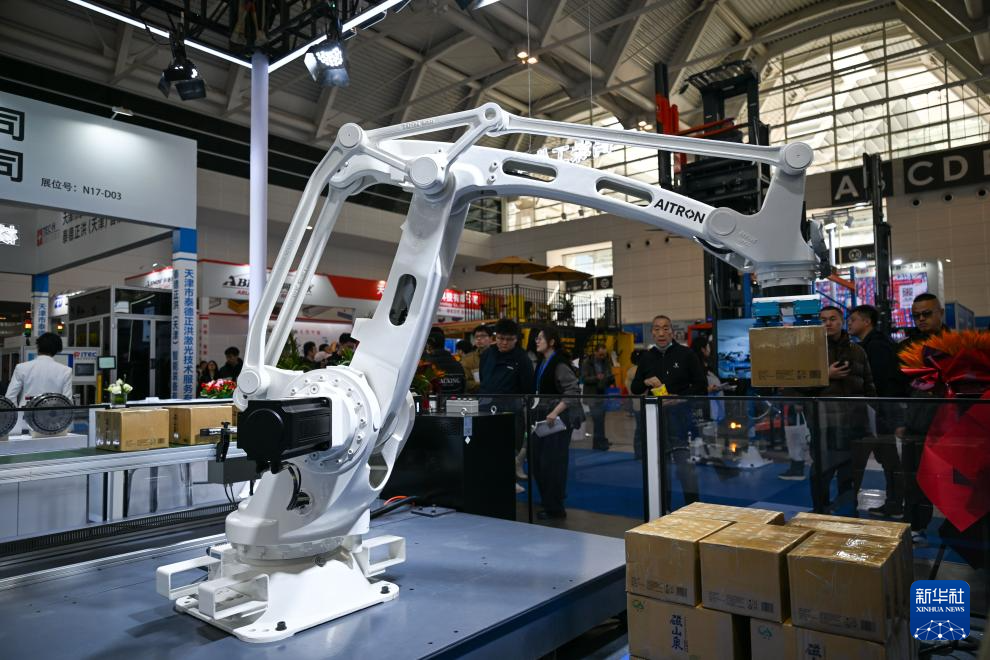 3月18日,一台搬运机械臂在天津工博会上向观众进行演示。新华社记者 孙凡越 摄pagebreak